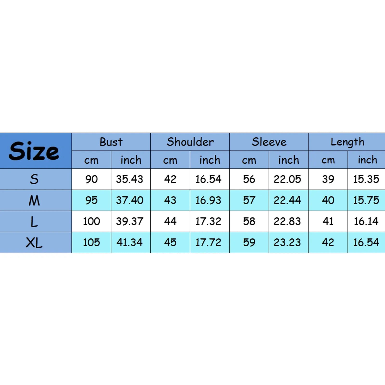 | Size:S | bust:90cm/35.43'' | Shoulder:42cm/16.54'' | Sleeve:56cm/22.05'' | Length:39cm/15.35'' |
