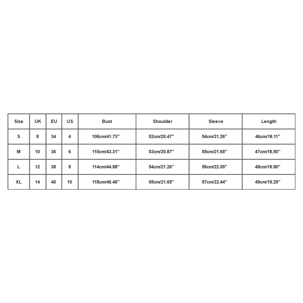 | Size:XL | UK:14 | EU:40 | US:10 | Bust:118cm/46.46'' | Shoulder:55cm/21.65'' | Sleeve:57cm/22.44'' | Length:49cm/19.29'' |